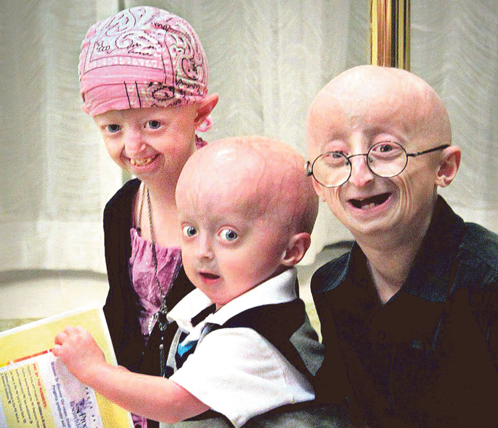 La progéria est une maladie génétique très rare qui provoque des changements physiques qui s’apparentent à un vieillissement accéléré . Il n’y a pas de traitement spécifique connu. L’espérance de vie se situe entre 13 et 16 ans. La morphologie du visage se caractérise par sa petitesse, de petites mâchoires et un crane très volumineux